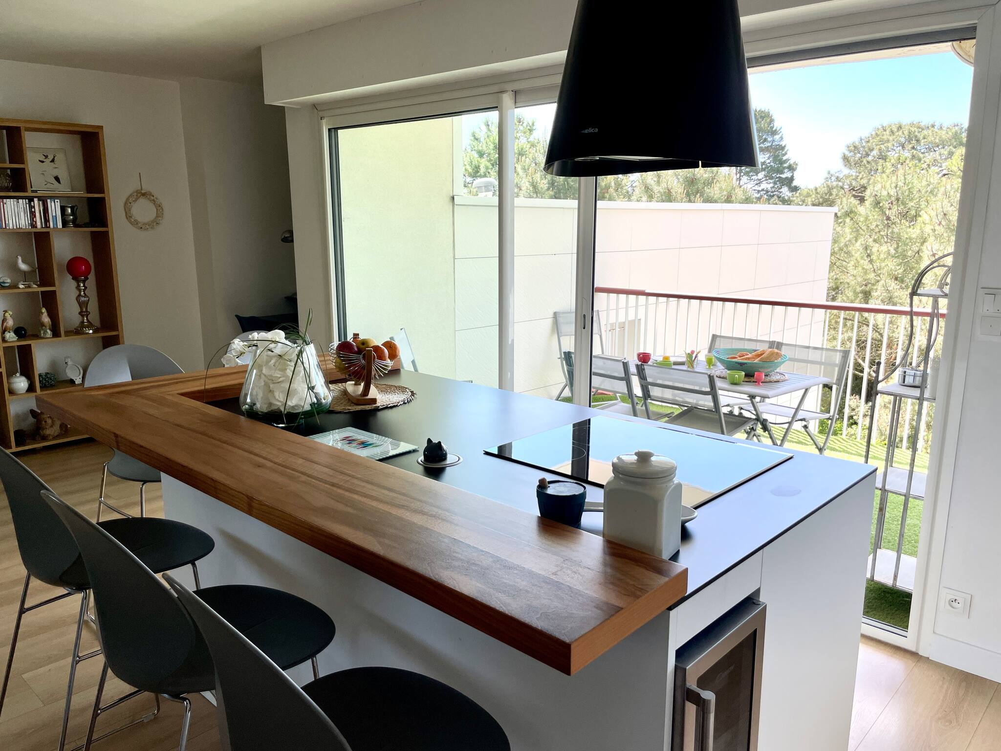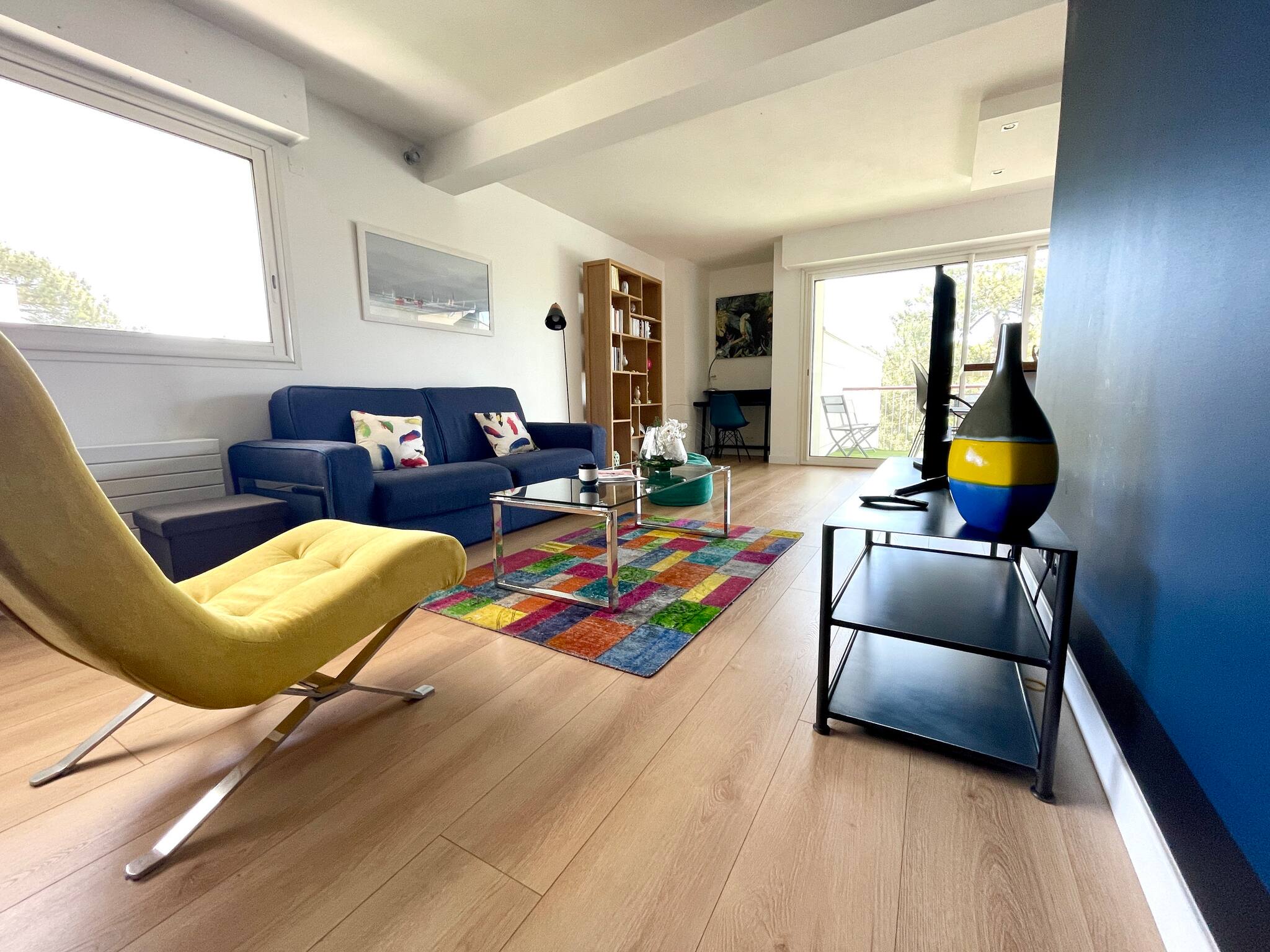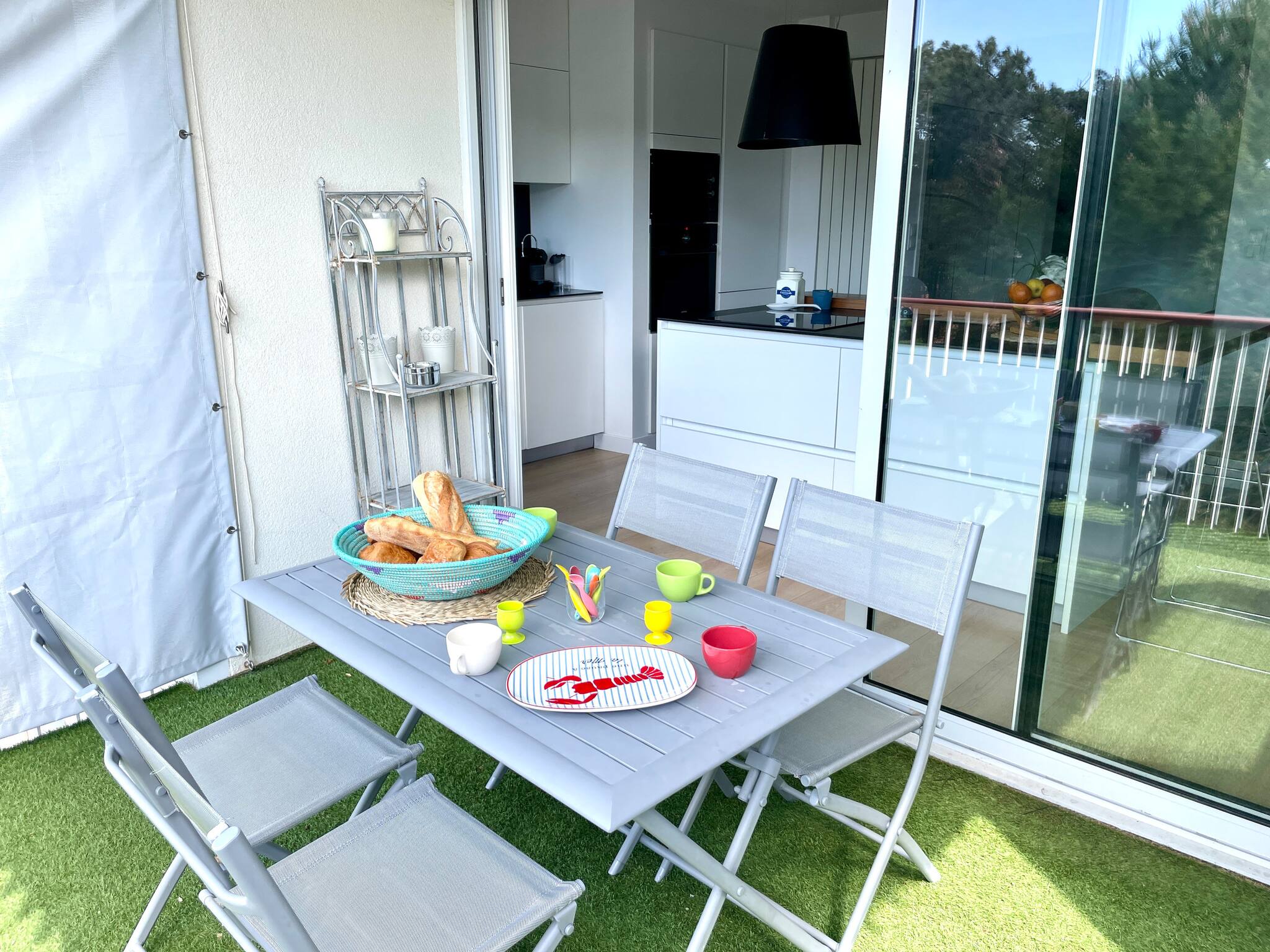 The living area is very bright and opens onto a large terrace (outdoor table with 4 seats)