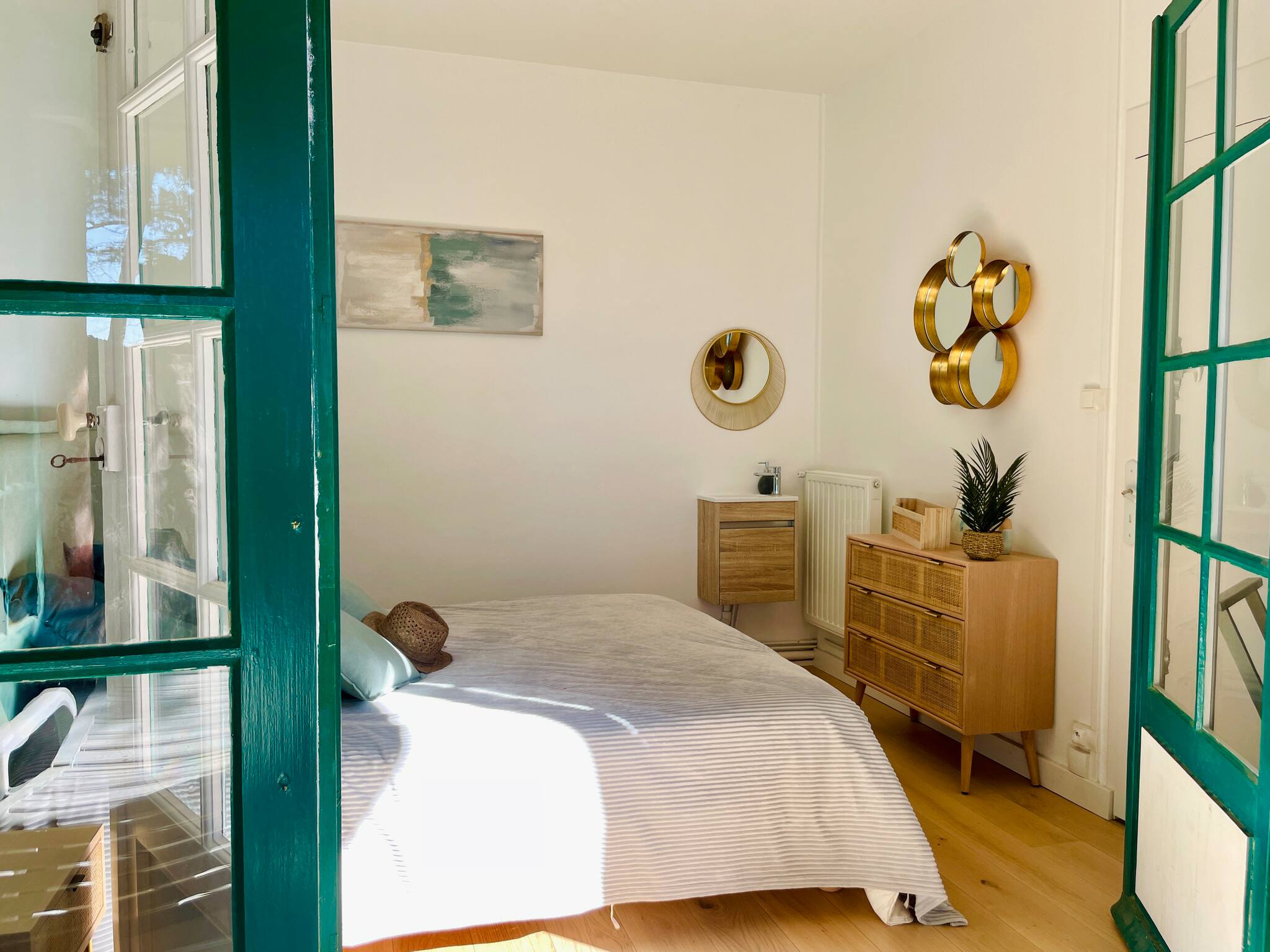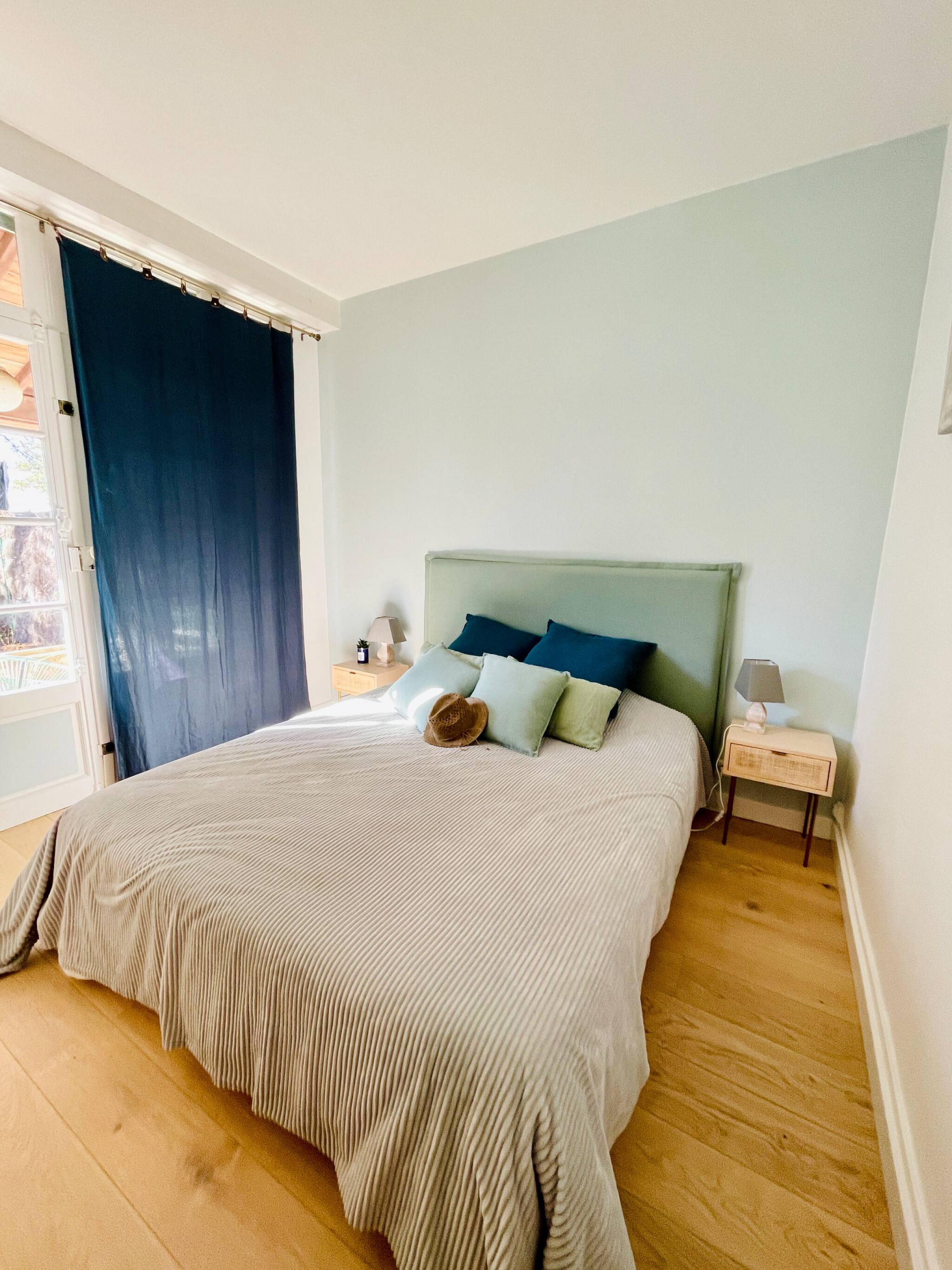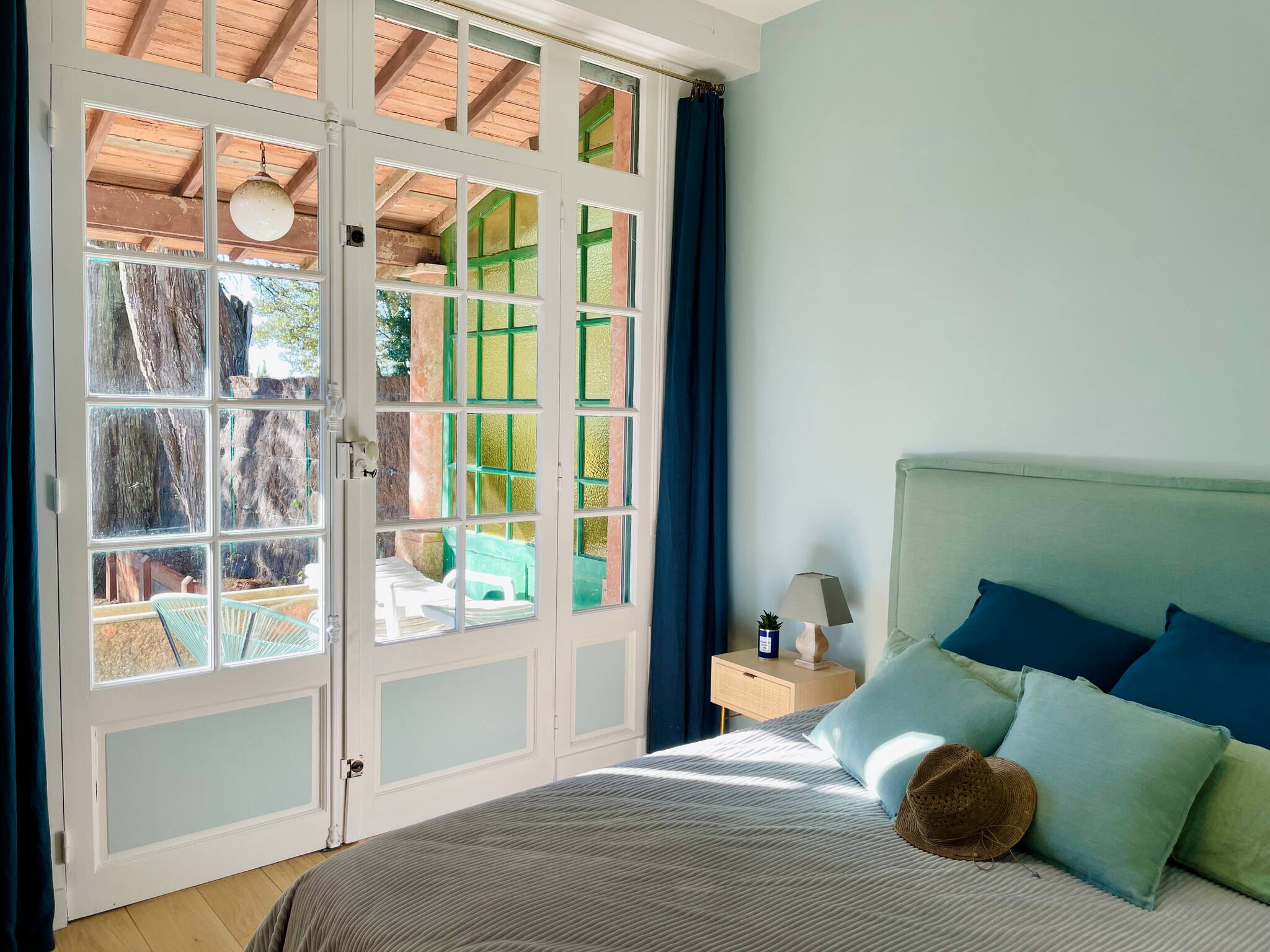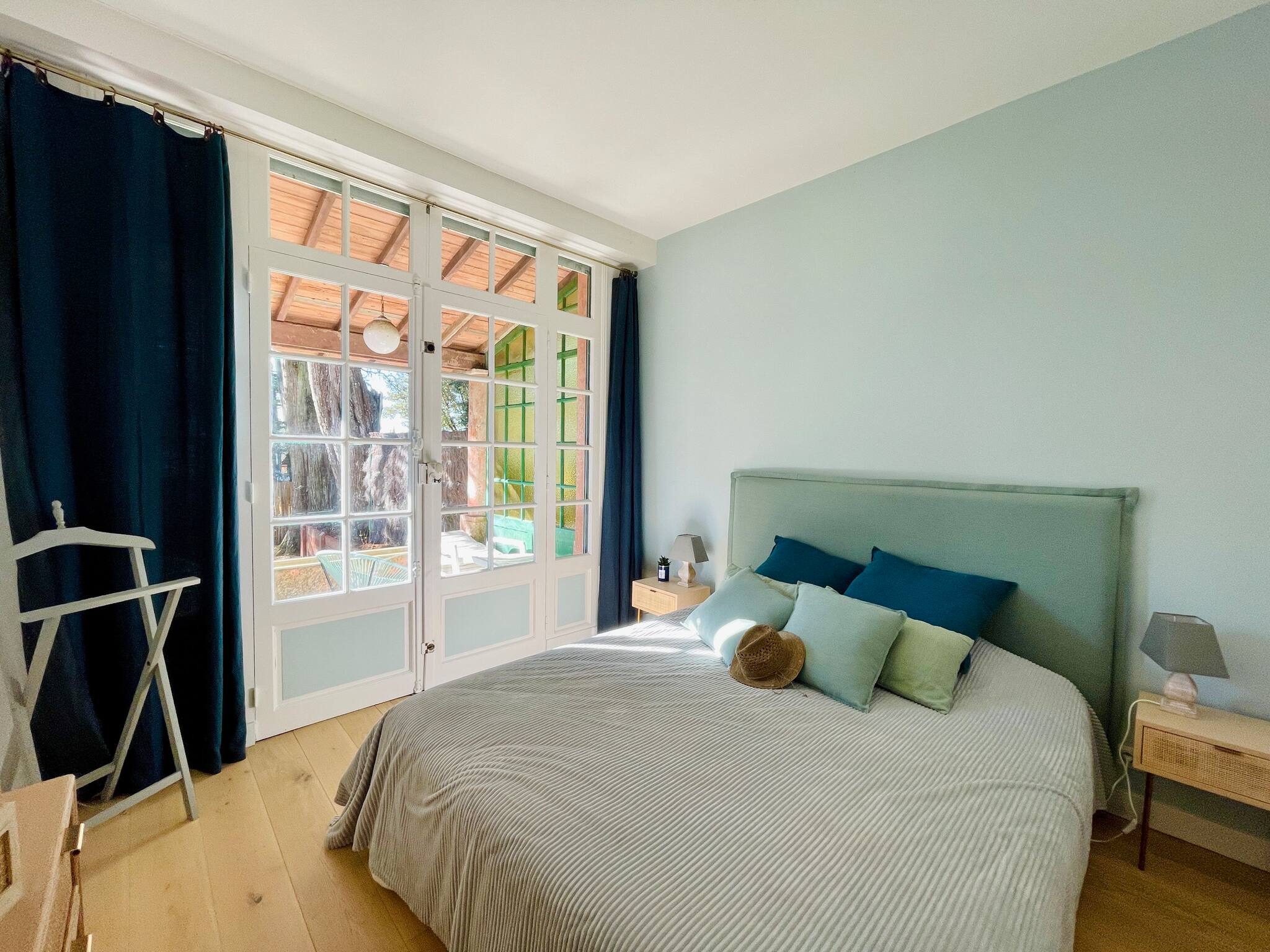 Room 1: Master bedroom with 160x200 bed with terrace access and garden view.