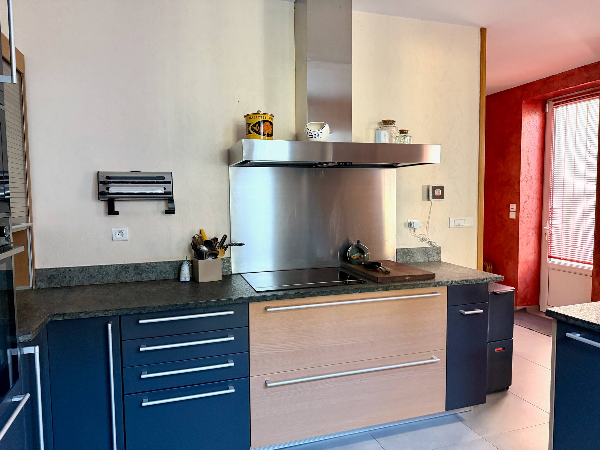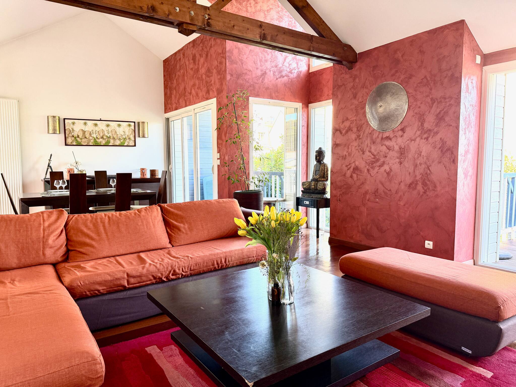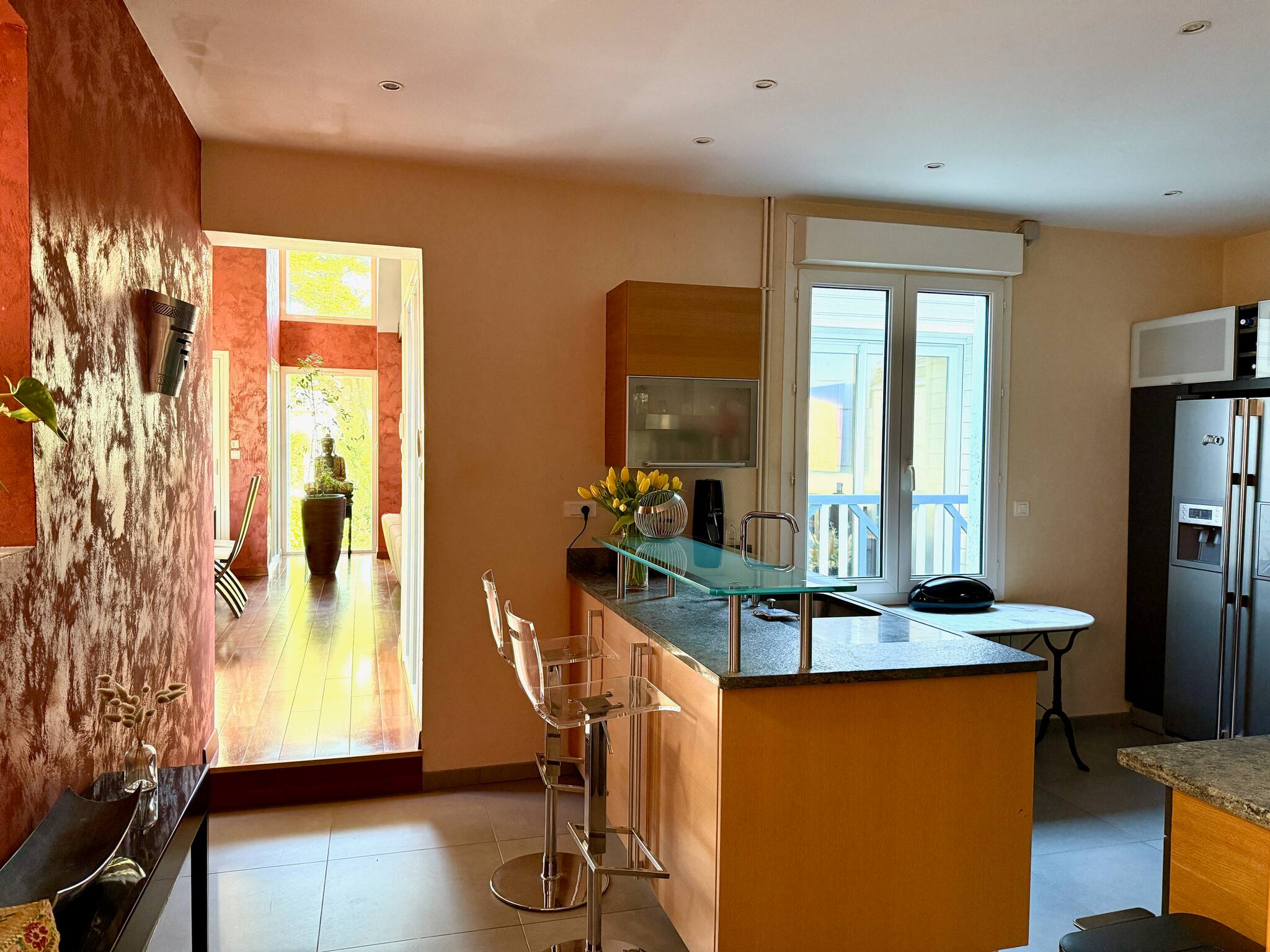 From the entrance, you discover a vast, bright living space open to the dining room, living room, kitchen and exterior. The house opens on one side to a terrace with a view of the wooded garden.