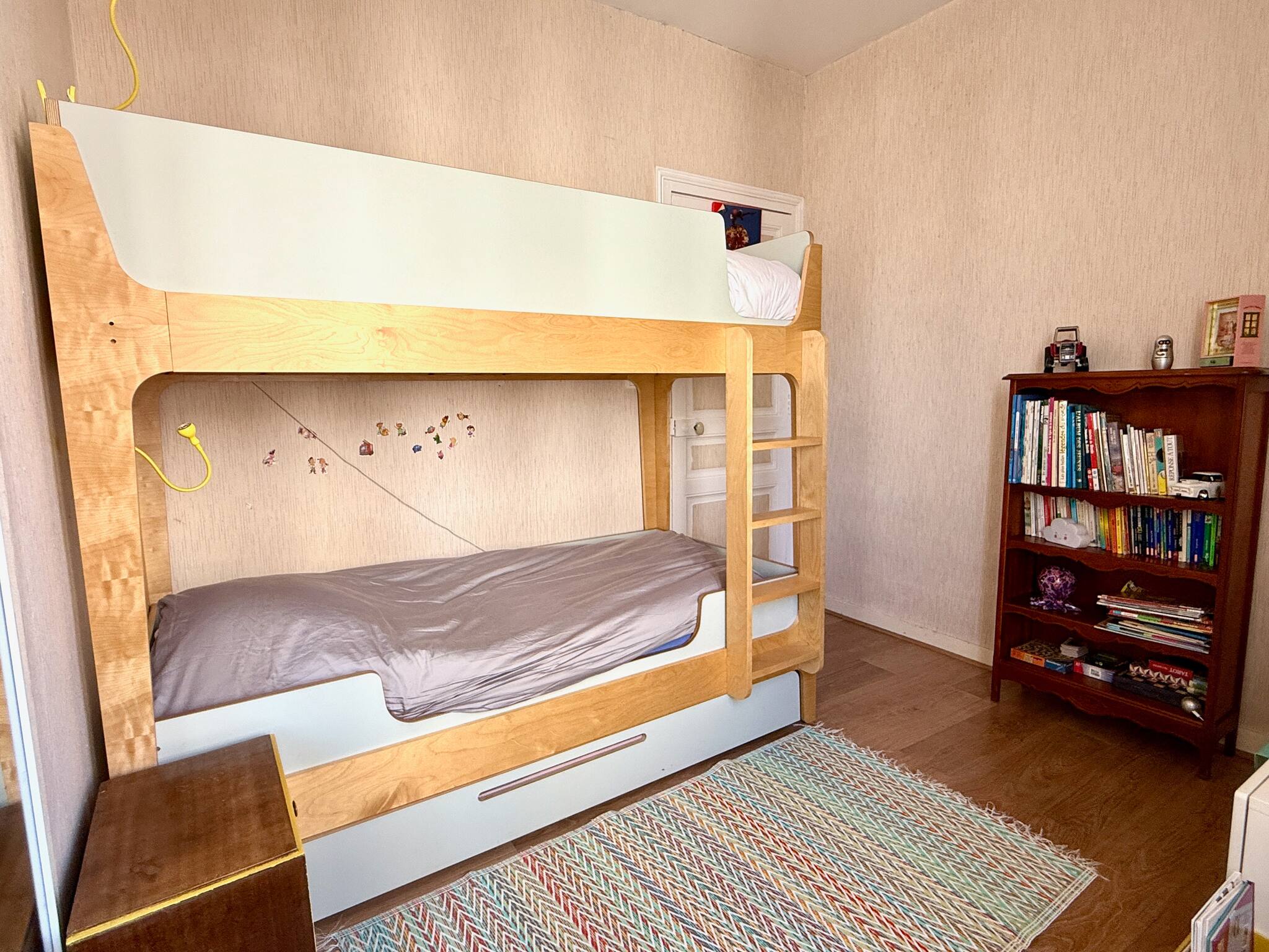 • Upstairs: two bedrooms with double beds (140x190), each with its own en-suite bathroom, and a children's bedroom with bunk beds + storage bed (3 sleeping spaces in 90x190).