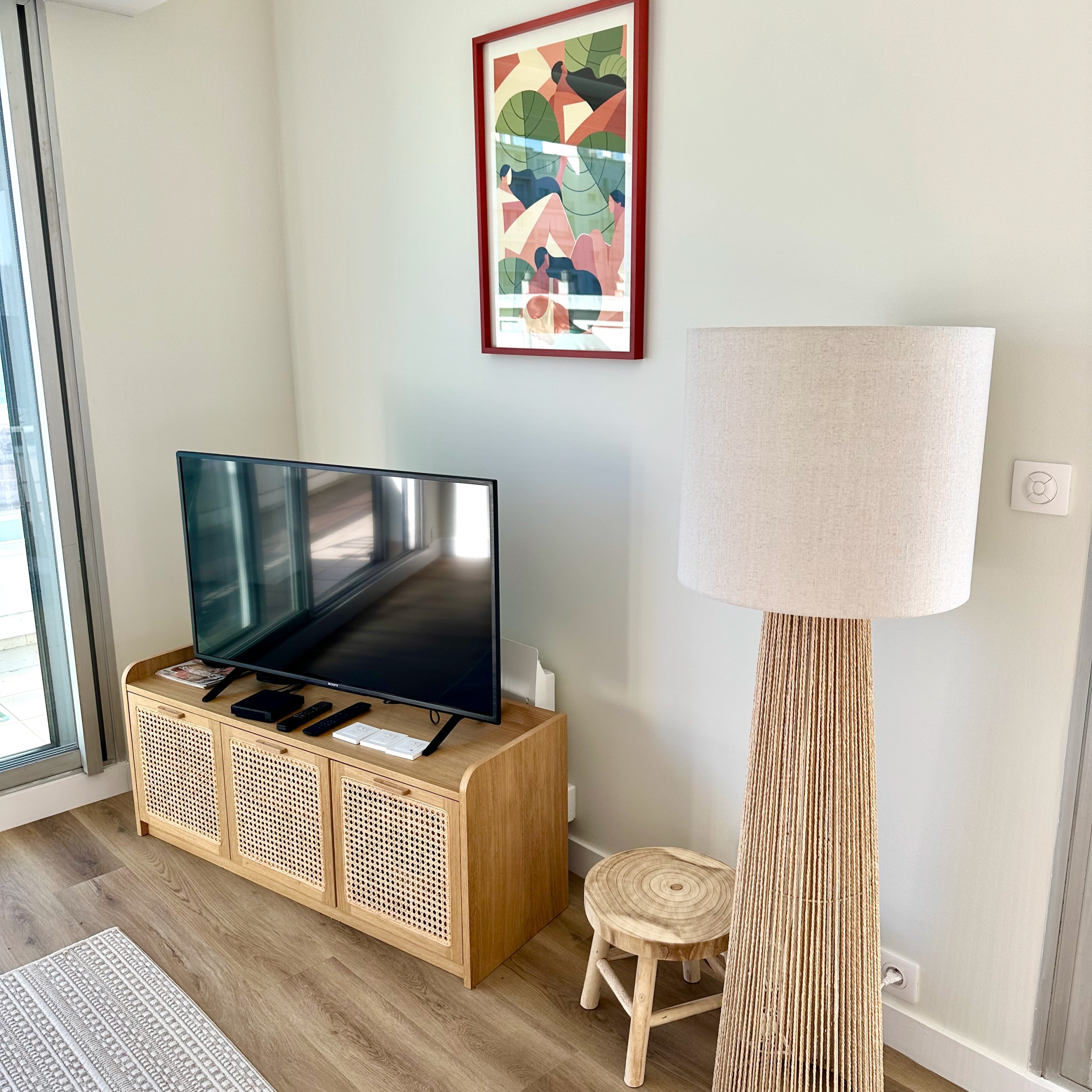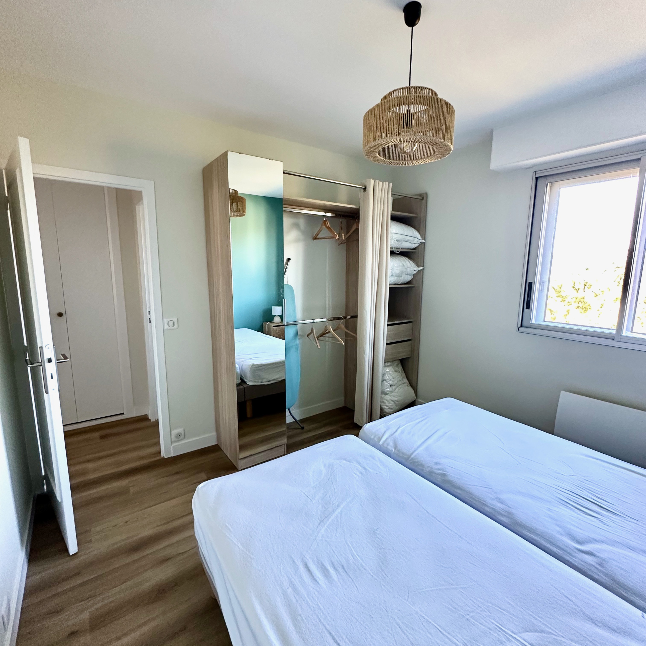 L'appartement dispose de deux chambres pour vous accueillir, une salle de bain, une cuisine ouverte sur le salon.