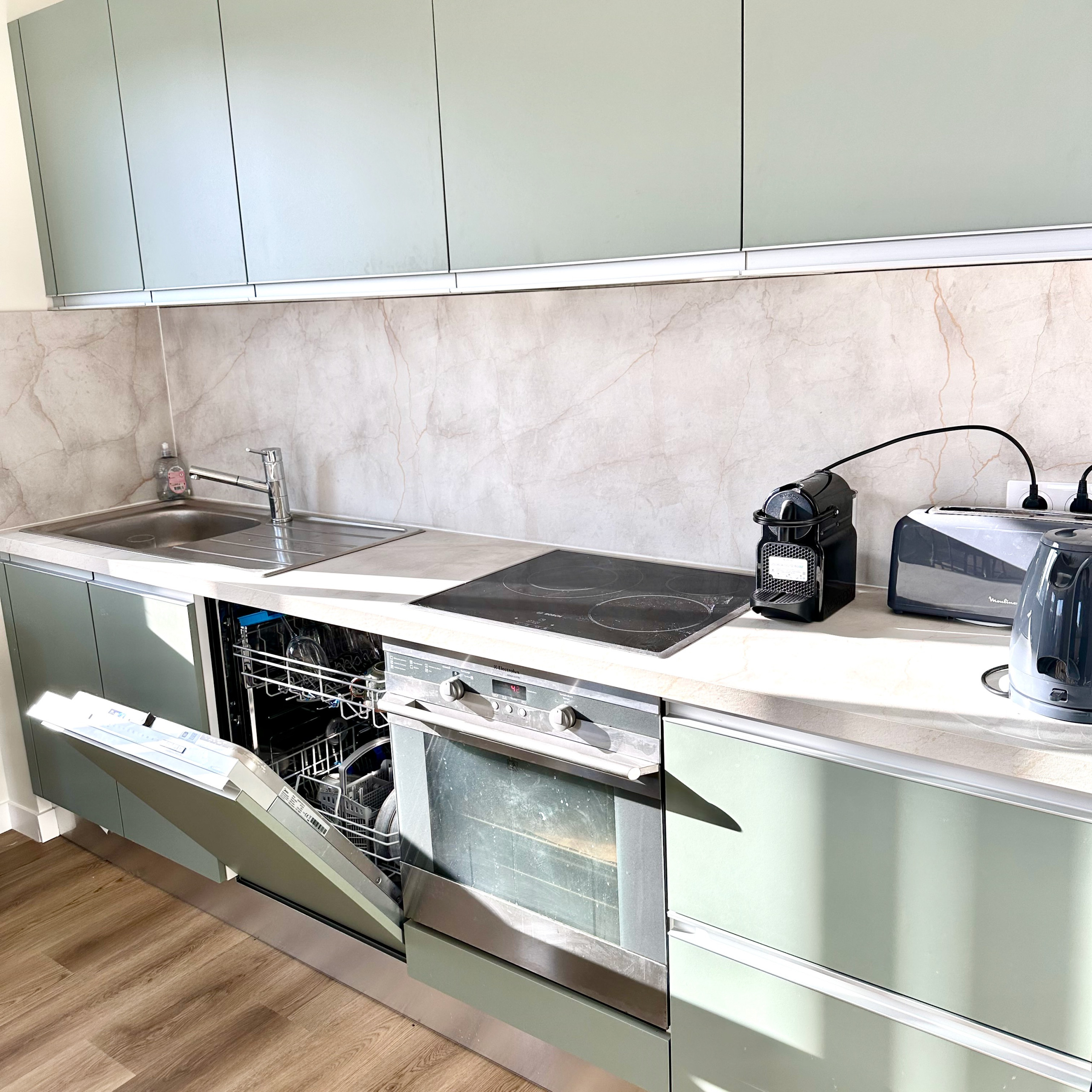 La cuisine américaine, à induction, est équipée avec réfrigérateur, micro-ondes, four, congélateur, lave-vaisselle, vaisselle/couverts, ustensiles/cuisine, cafetière, grille pain et bouilloire.