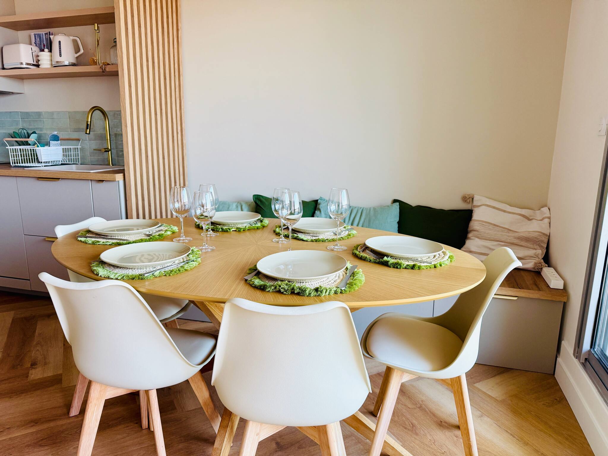 La cuisine est entièrement équipée : four, micro-ondes, plaque de cuisson, hotte, réfrigérateur-congélateur, lave-vaisselle, bouilloire, grille-pain.