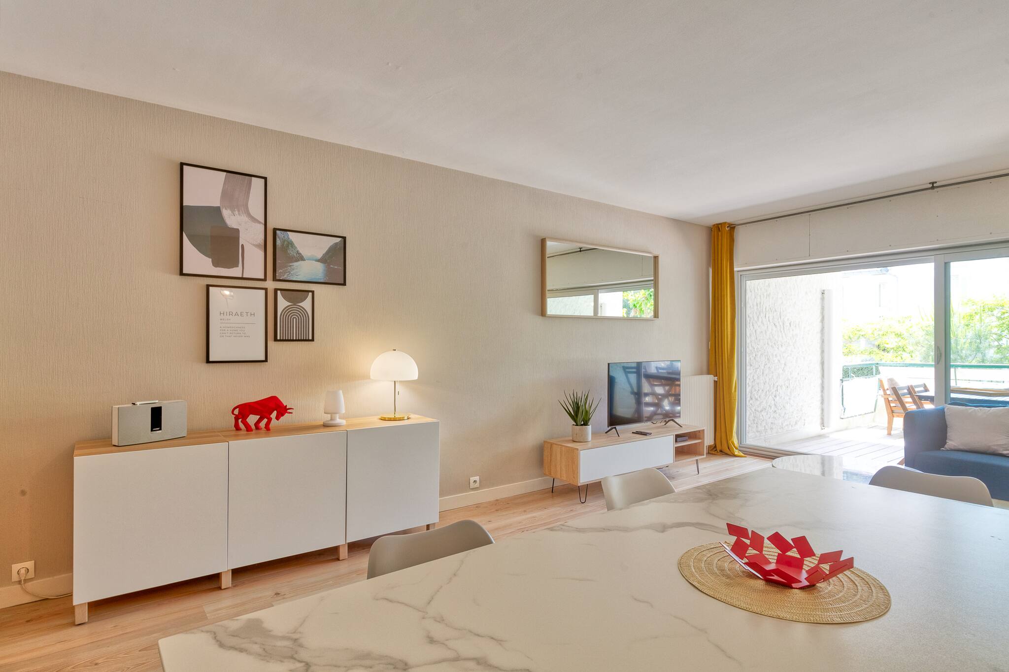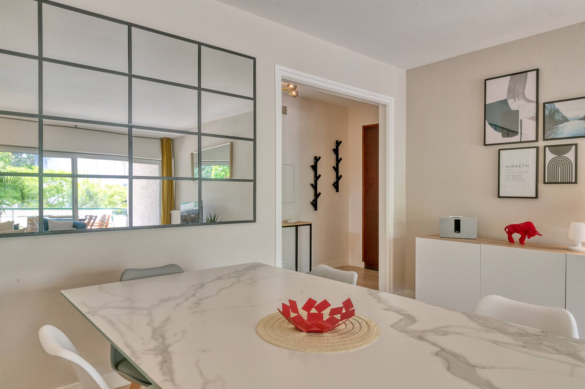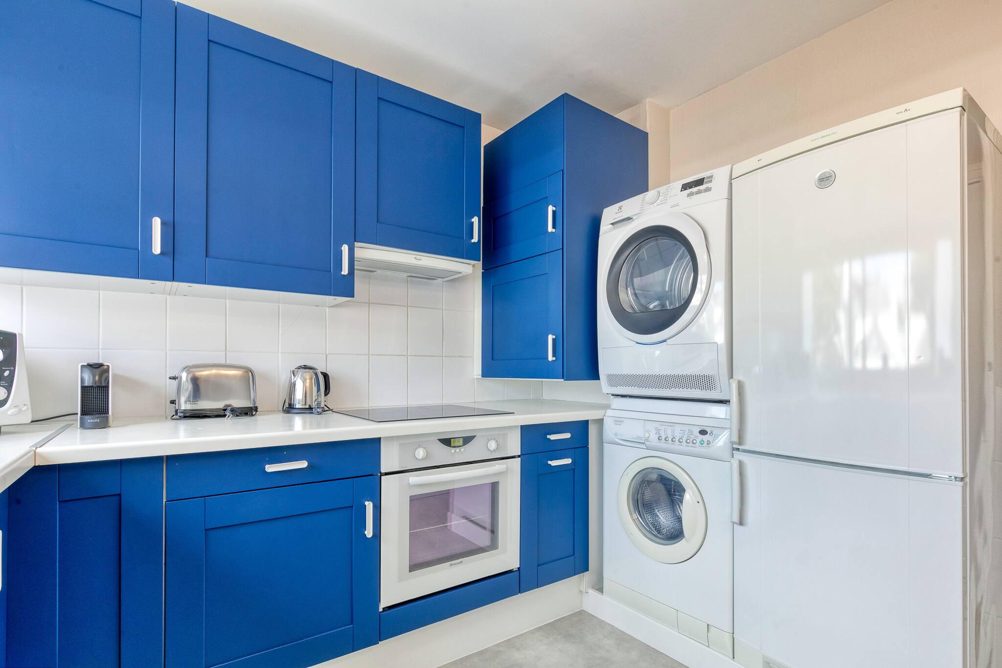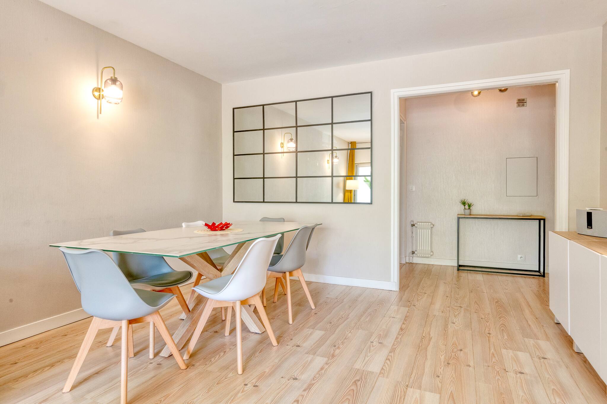 En entrant dans l'appartement vous découvrirez une grande pièce de vie avec salon (télévision, wifi, enceinte BOSE), salle à manger et une cuisine tout équipée (réfrigérateur avec congélateur, plaques à induction, hotte, bouilloire, four, grille-pain, lave-vaisselle, lave-linge, sèche-linge, fer à repasser)
