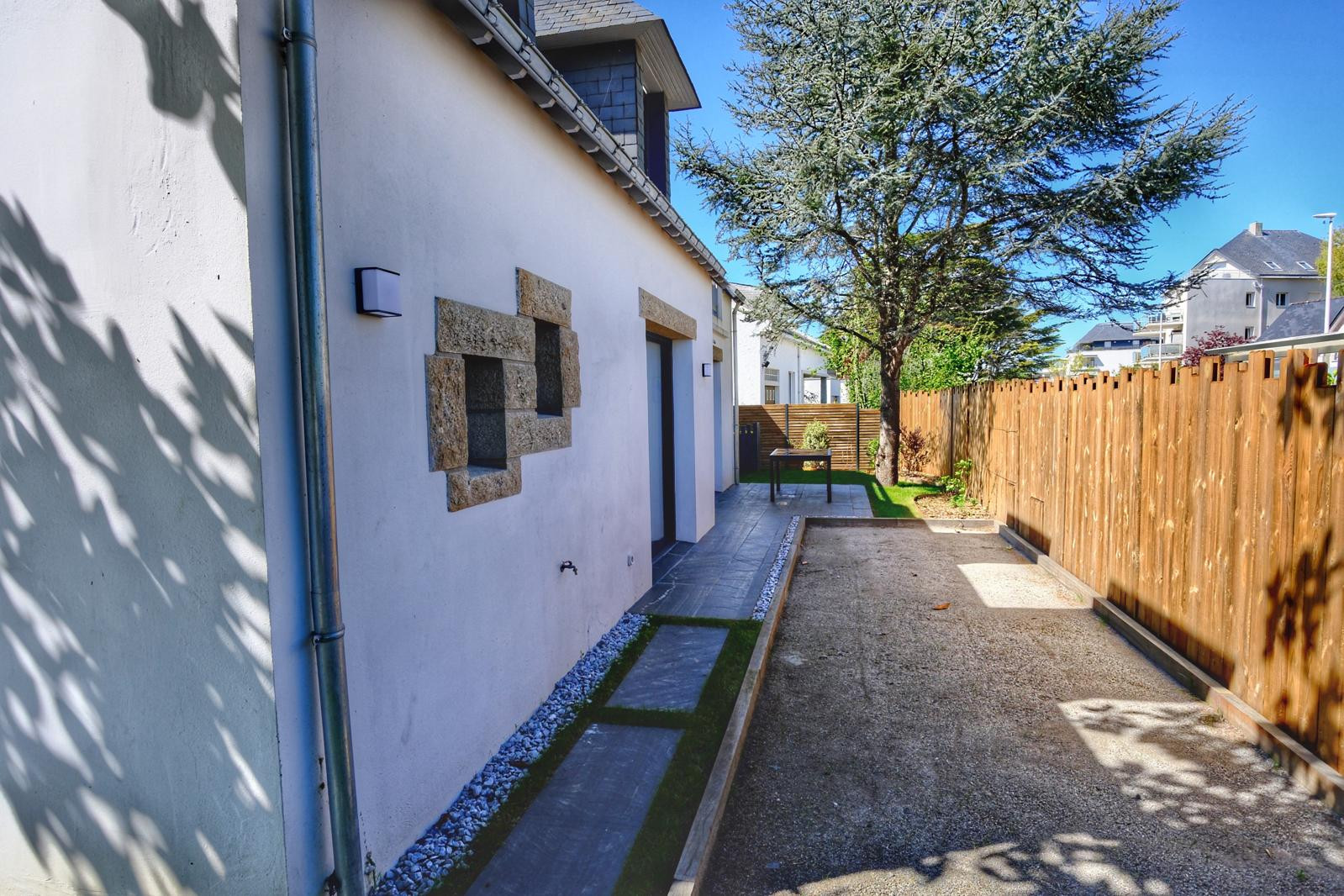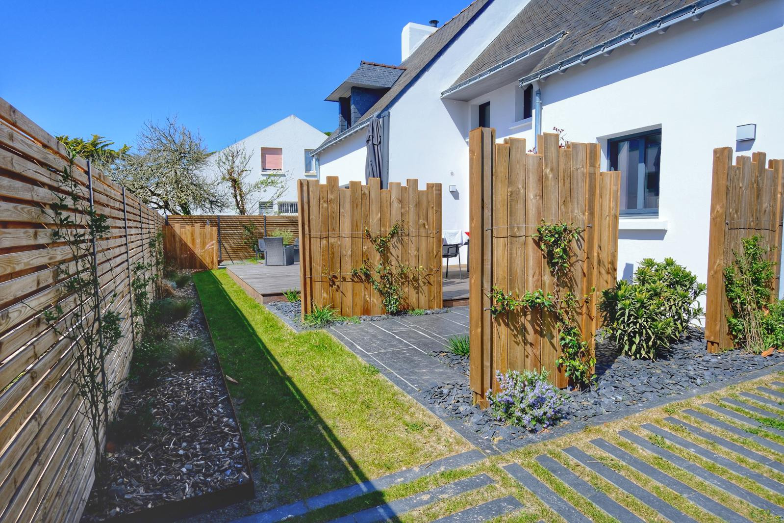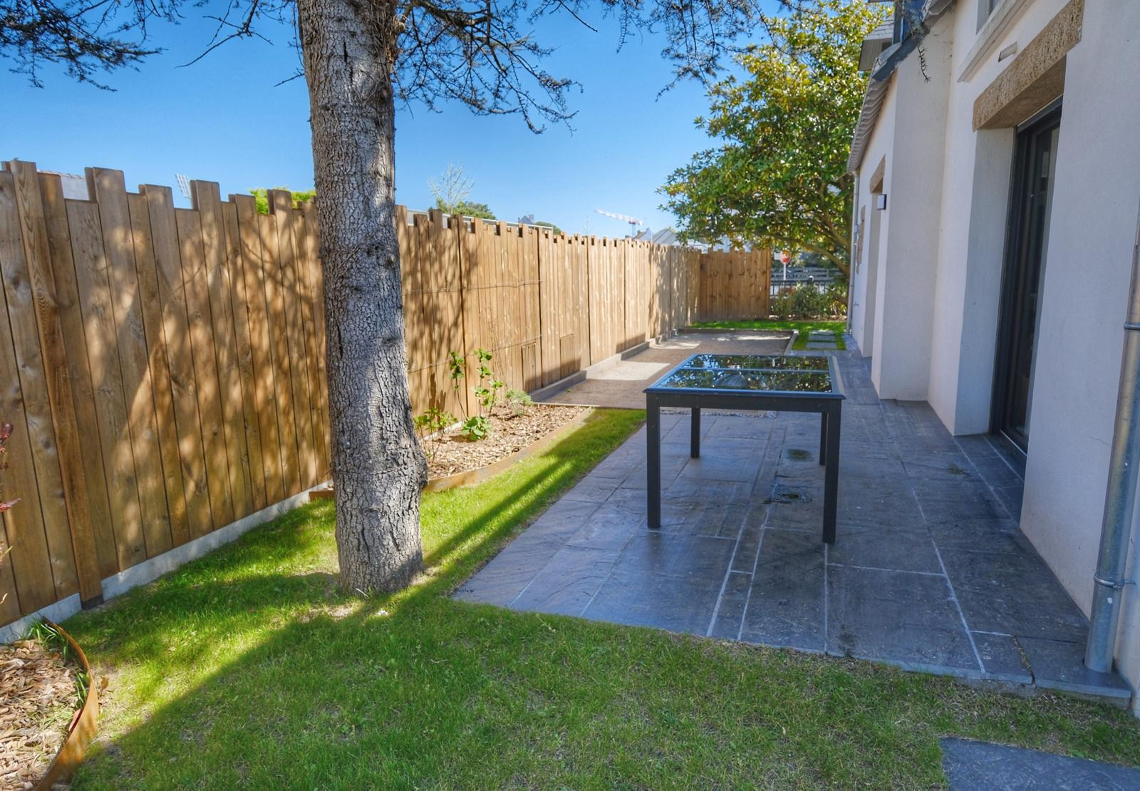 Un jardin clôturé et paysagé, parfait pour les enfants.