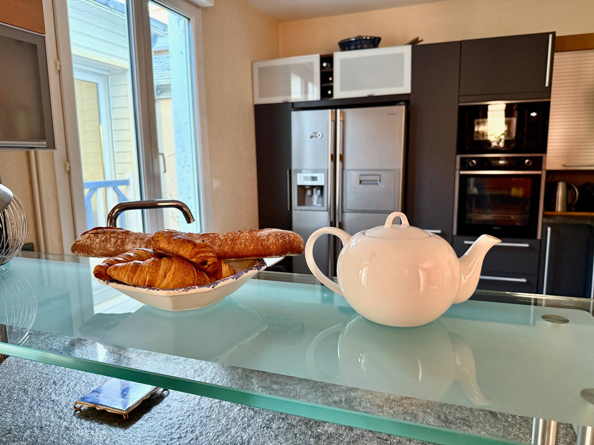 La cuisine est entièrement équipée : four, micro-ondes, plaques de cuisson, hotte, réfrigérateur, lave-vaisselle, bouilloire, grille-pain, machine à café Nespresso, Sodastream.