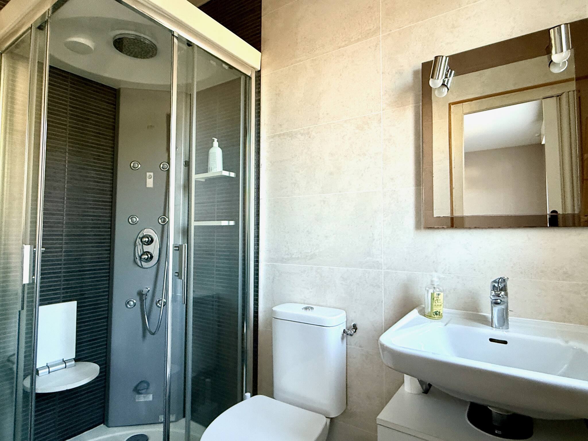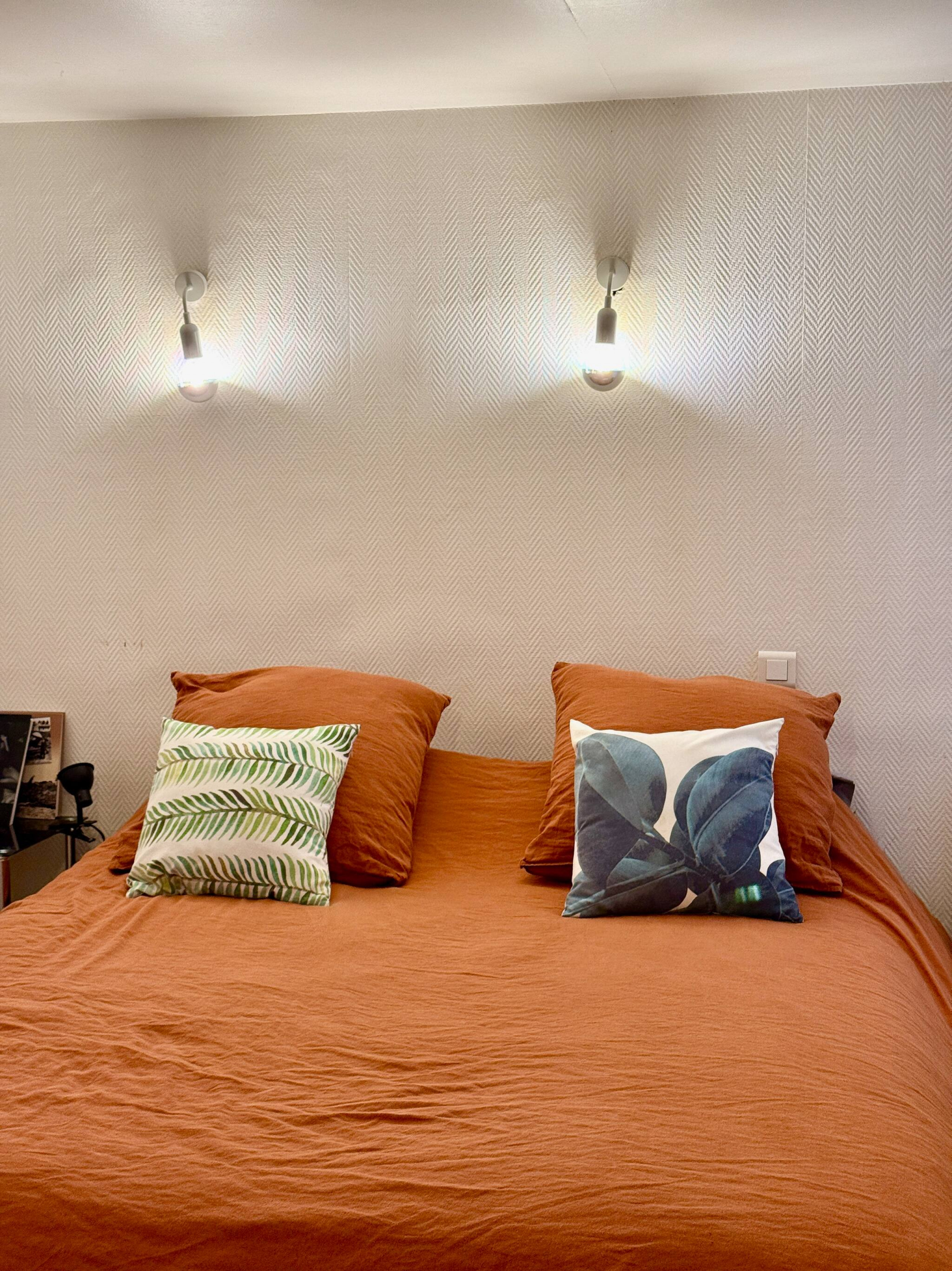 • Au rez-de-chaussée : une grande chambre avec lit double (180x190), proche d’une salle de bain avec buanderie.