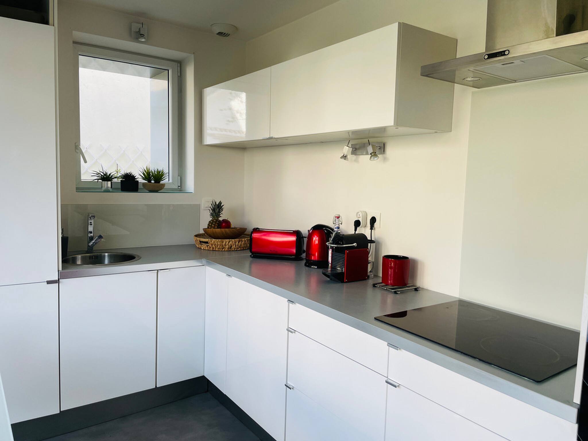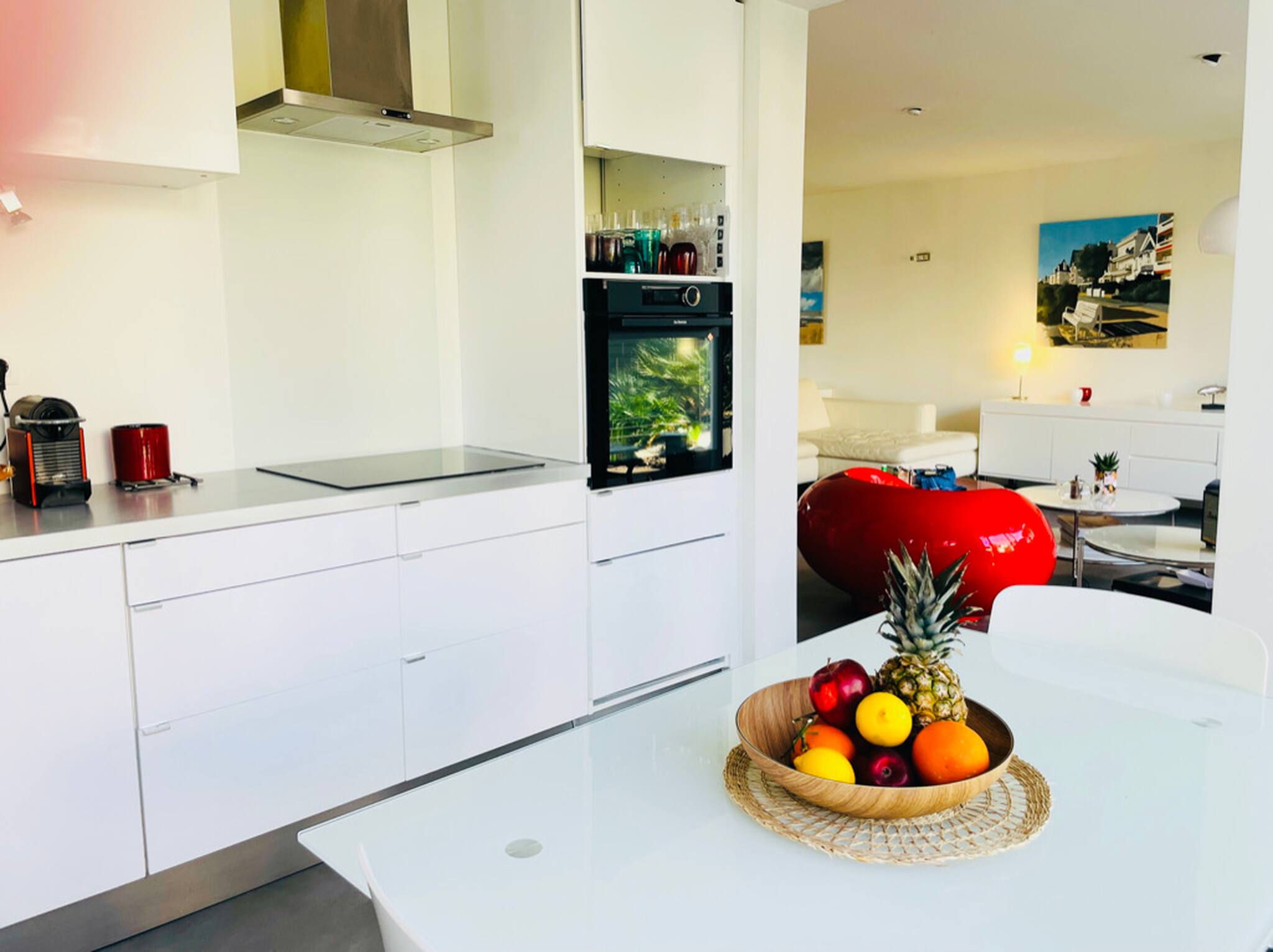 Sa cuisine moderne est entièrement équipée avec tout le nécessaire du quotidien (four, micro-ondes, grille-pain, réfrigérateur-congélateur, lave-vaisselle…).