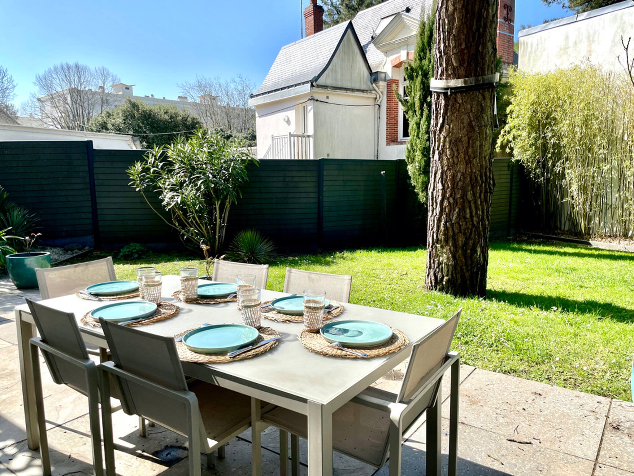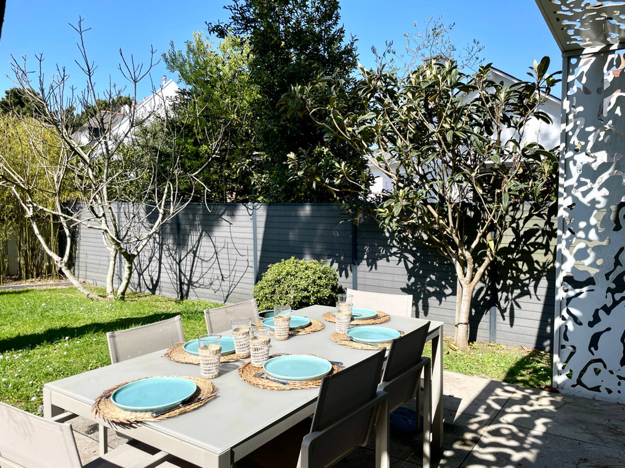 Une terrasse donnant sur le jardin avec table extérieure et chaises, nombre d’assises : 8