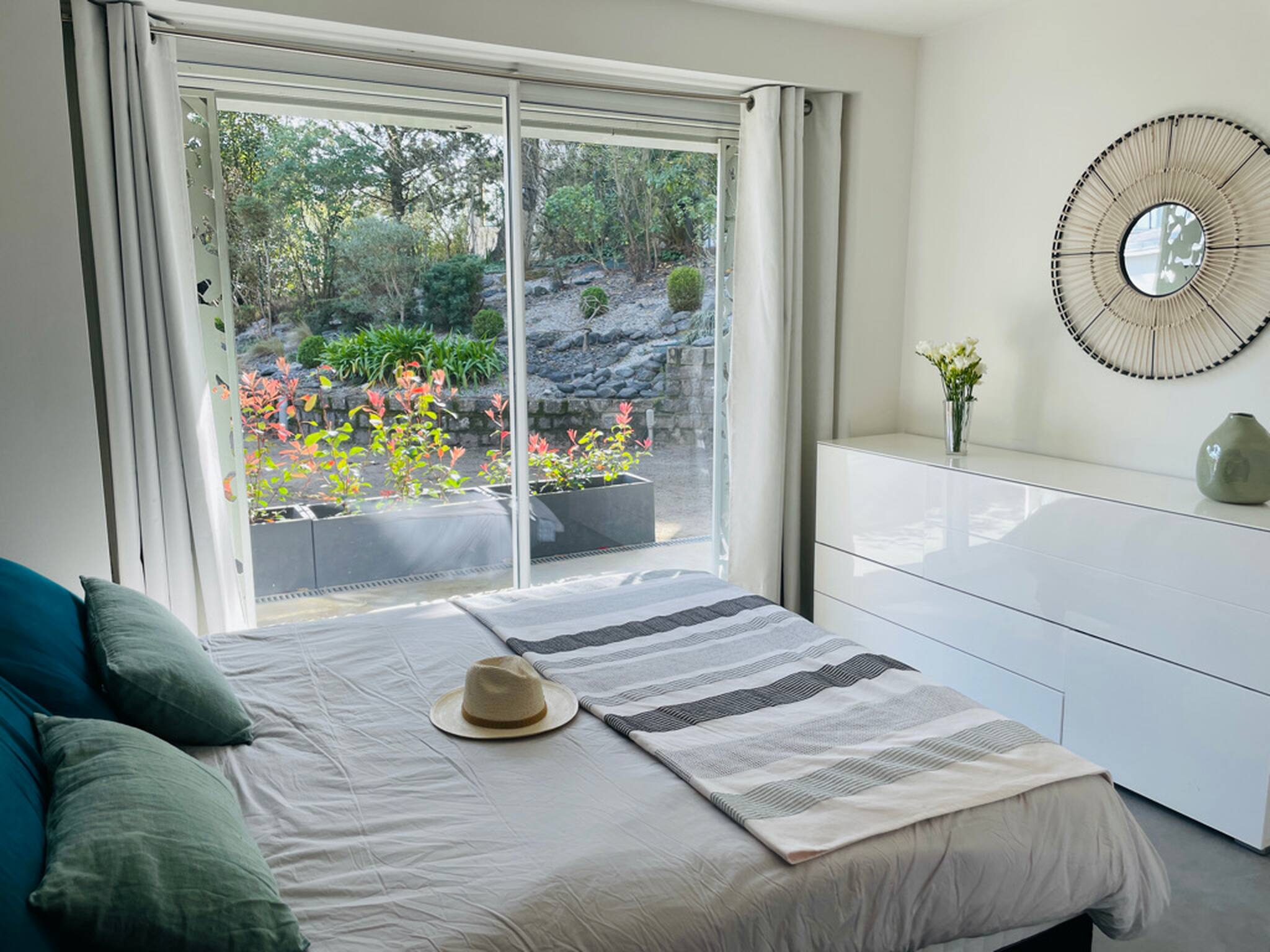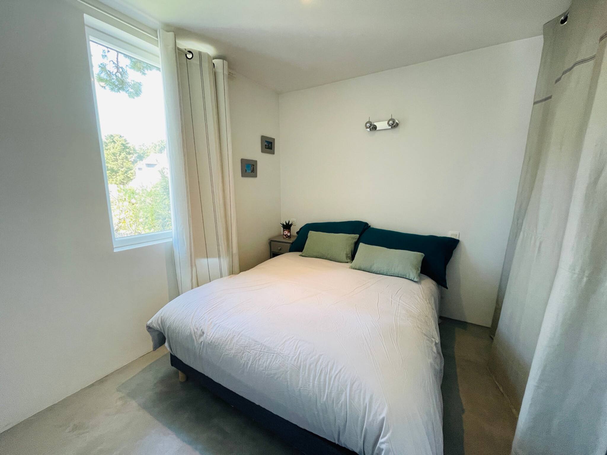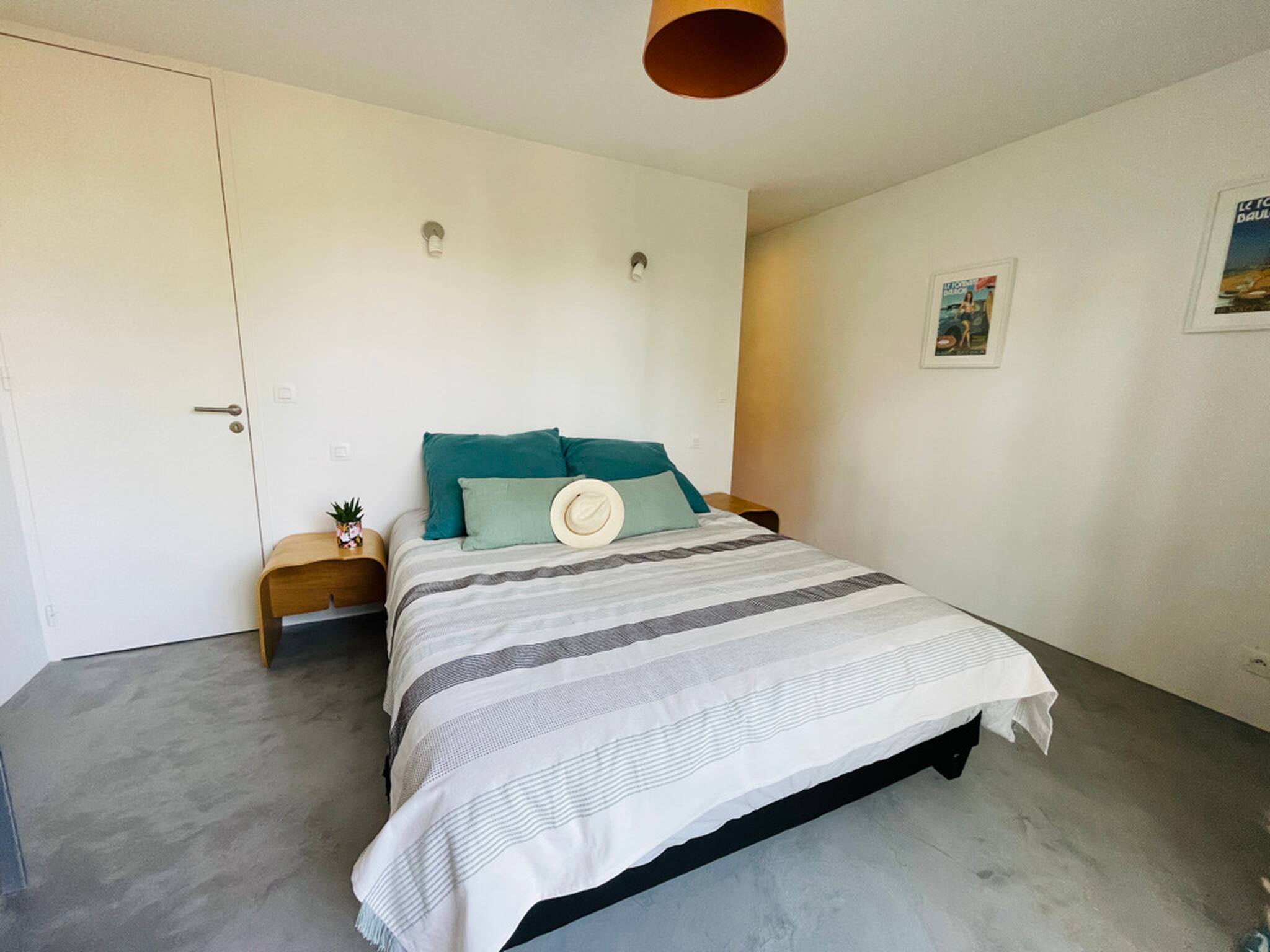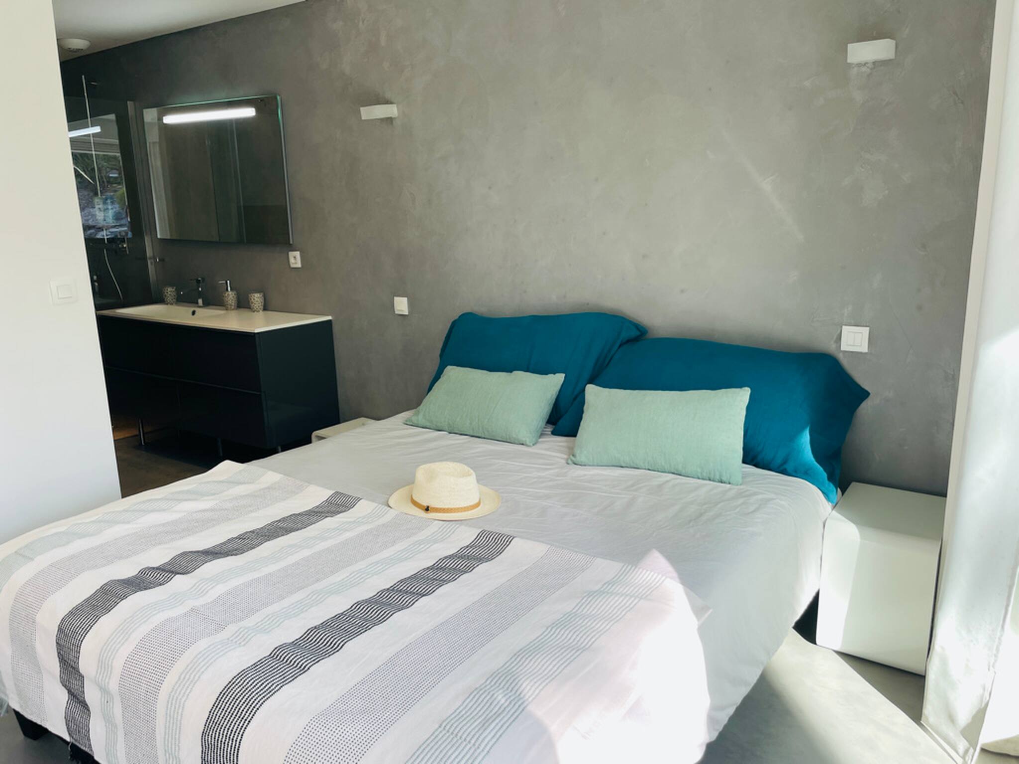 Chambre 2 (à l’étage) : lit Queen size 160x200 avec accès terrasse et salle d’eau attenante