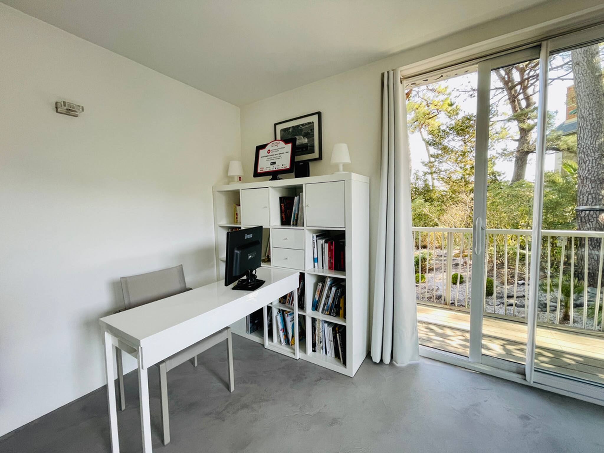 Un grand et beau salon avec un espace bureau se trouve à l'étage donnant sur la terrasse à l'étage.